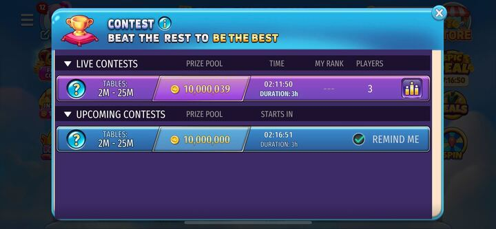 Contests are one of the ways to show that you’re the ultimate Rummy Rush player! You can find out which Contest is happening when it ends and how much the total pool is using the banner that appears over the corresponding tables.