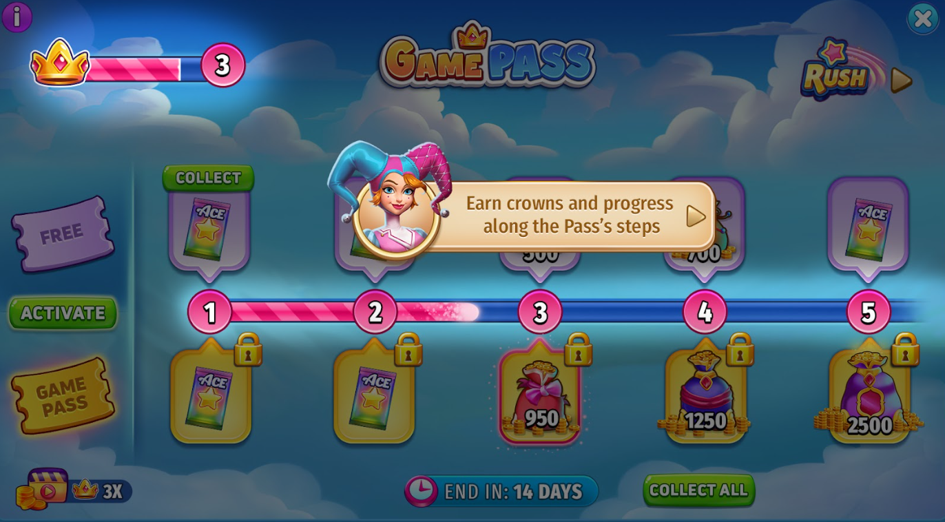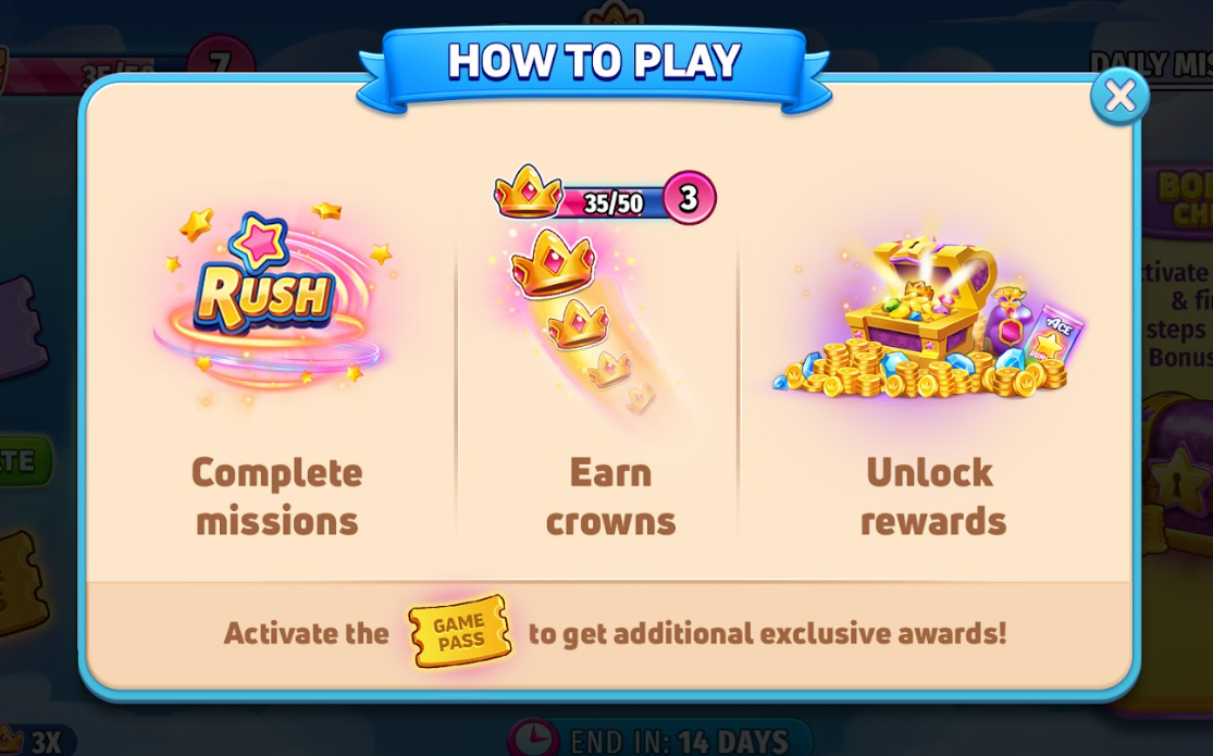 Crowns earned continue to accumulate even after you've completed all the stages, allowing you to fill the crown bar multiple times. With each completion of the crown bar, you'll accumulate the specified amount of coins. These accumulations progressively fill the Bonus Chest, which can be opened on the FINAL day of the Game Pass!